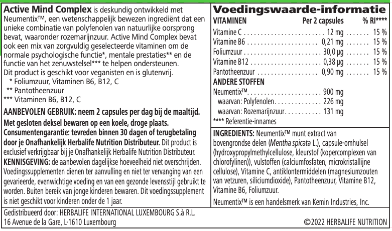 Ondersteun jouw mentale prestaties* en blijf de controle houden over dagelijkse taken, zelfs op je meest hectische dagen. Active Mind Complex is ontwikkeld met een wetenschappelijk bewezen gepatenteerd spearmint ingrediënt met vele voordelen.