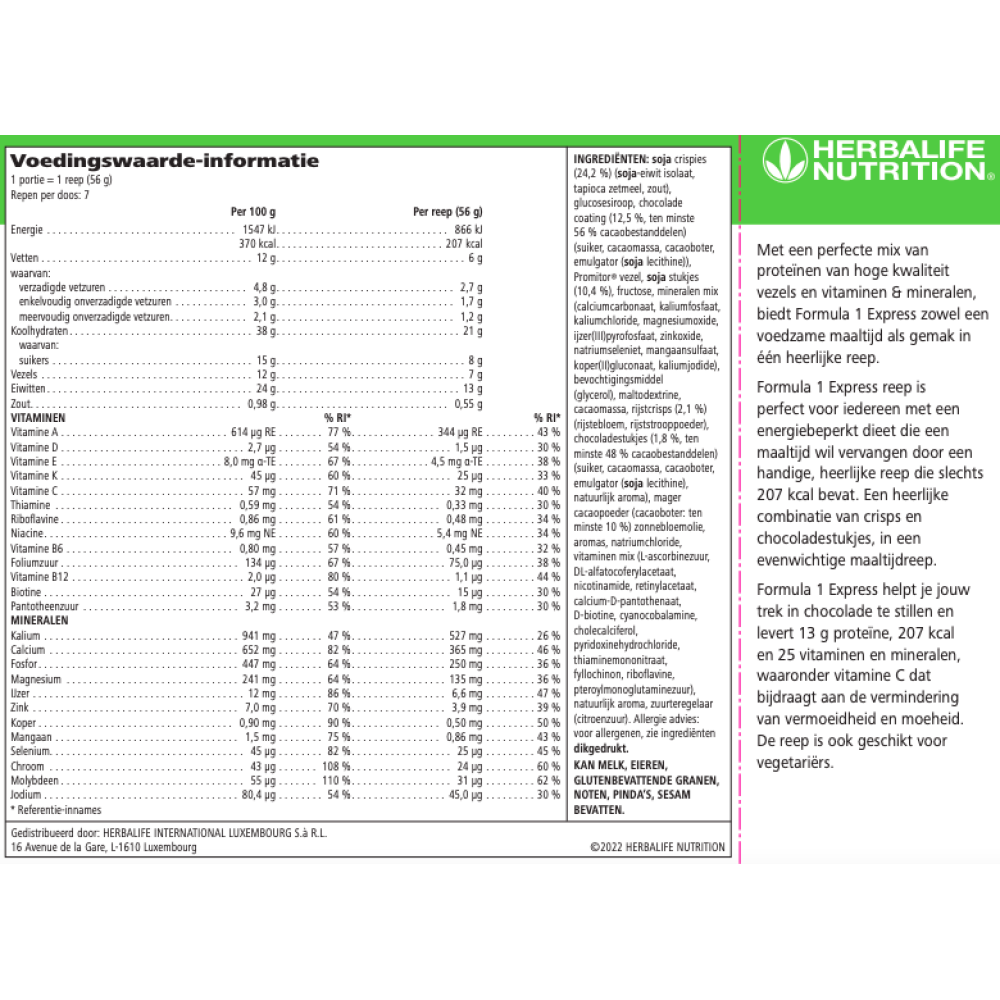 Een F1 Evenwichtige Maaltijdreep heeft alle goede voedingsstoffen die ook in een F1 shake of evenwichtige maaltijd zitten*.