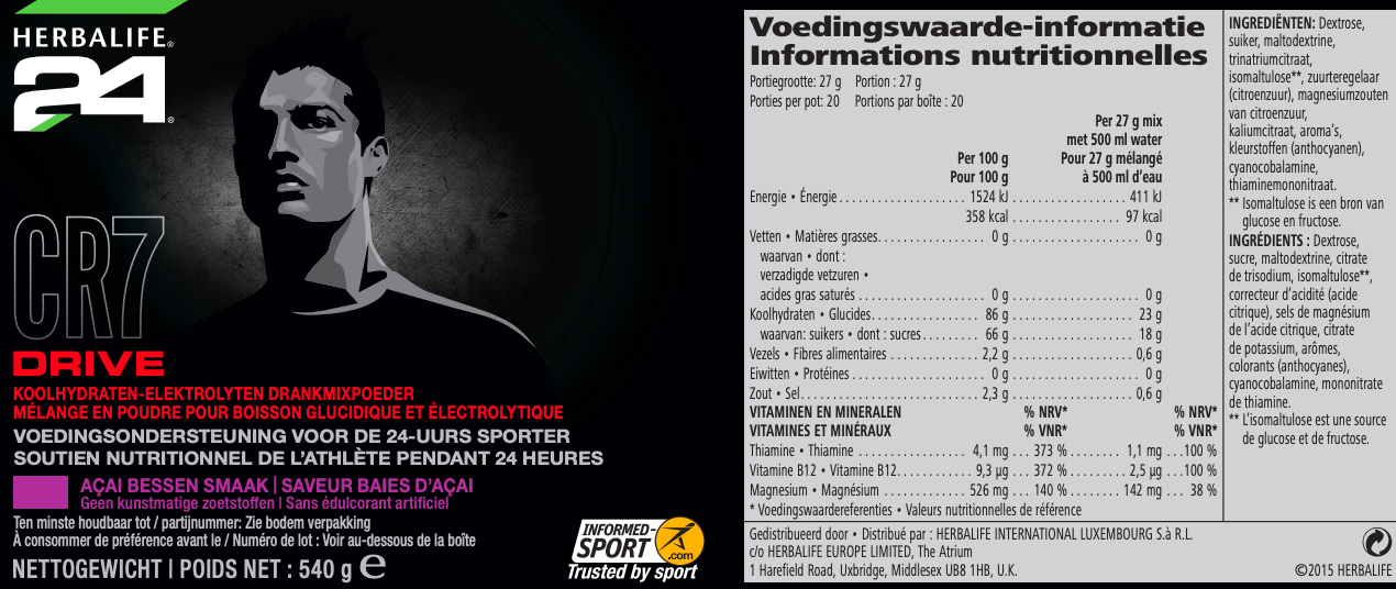 • Ontwikkeld in samenwerking met Cristiano Ronaldo, een van de elitespelers binnen wereldvoetbal.• Elke portie CR7 drive bevat minder dan 100Kcal