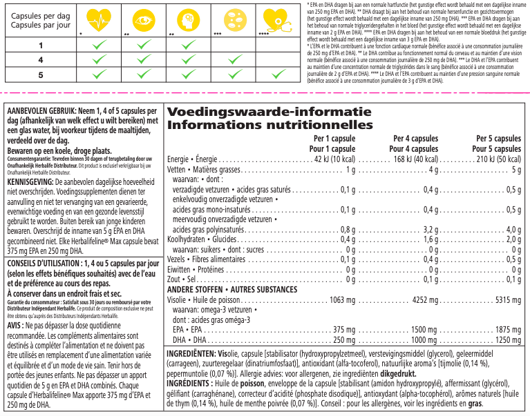 Herbalifeline® Max is een voedingssupplement, rijk aan Omega-3 essentiële vetzuren EPA en DHA, welke bijdragen aan een normale functie van het hart, alsmede het behoud van normale bloeddruk en bloedtriglyceride niveaus. DHA draagt ook bij aan het behoud van een normale hersenfunctie en zicht.