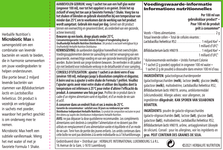 Microbiotic Max biedt een combinatie van probiotica en prebiotische vezels, die in harmonie samenwerken om jouw voedingsdoelen te helpen ondersteunen. Elke portie bevat 2 miljard levende bacteriën van stammen van Bifidobacterium lactis en Lactobacillus helveticus. Dit product is vezelrijk en verkrijgbaar in zakjes in poedervorm, wat het ideaal maakt om overal mee naartoe te nemen. Microbiotic Max heeft een subtiele vanillesmaak. Meng met water of voeg toe aan je volledig bereide Formula 1 shake.