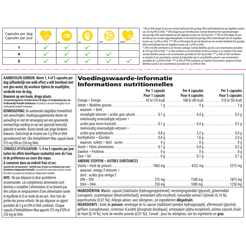 * Het gunstige effect wordt behaald met een dagelijkse inname van 250mg EPA en DHA.
