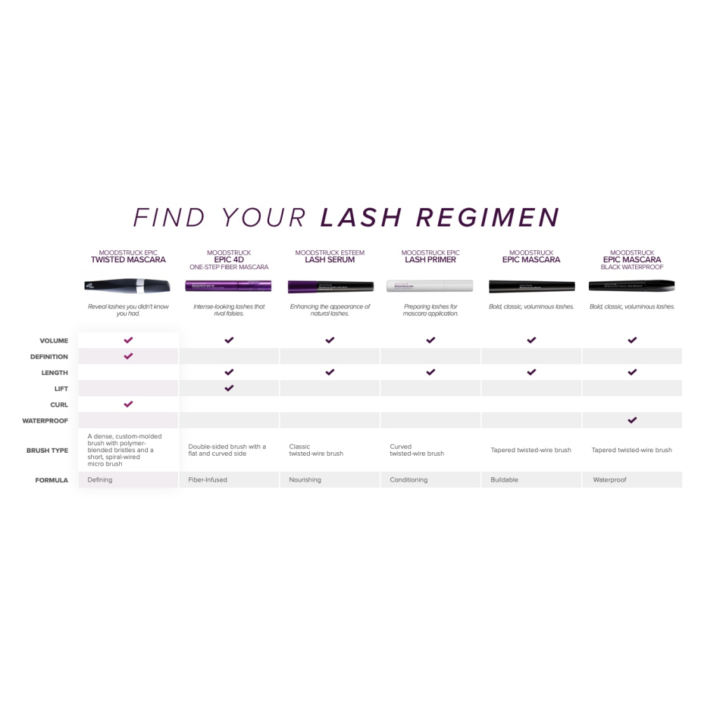 Don’t be shy, little lashes—step into the spotlight with MOODSTRUCK EPIC twisted mascara. This black mascara utilizes two high-quality applicators that work in tandem to search out each lash, separating and defining to reveal lashes you didn’t even know you had! In fact, this mascara had 97% of consumers agreeing that their lashes were evenly coated* and 95% agreeing that their lashes were well-defined throughout the day.**