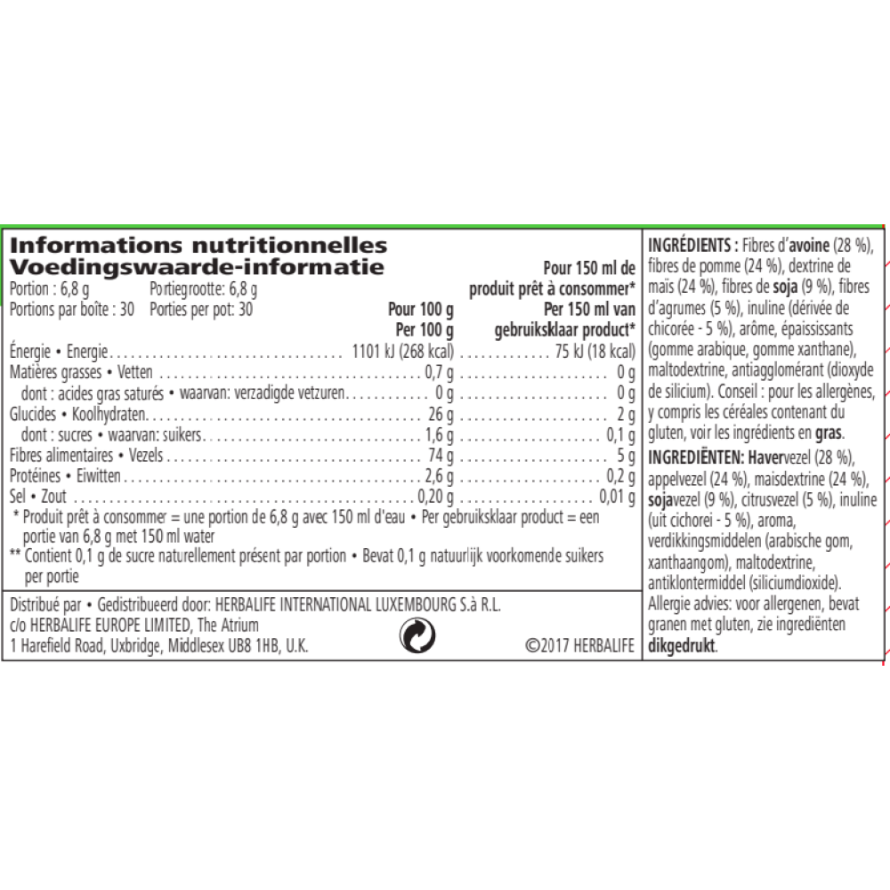 Een unieke mix van oplosbare en onoplosbare vezels zonder toegevoegde suikers of kunstmatige zoetstoffen. Multivezel drank bevat 6 vezelbronnen – appel, haver, maïs, citrus, chicorei en soja.