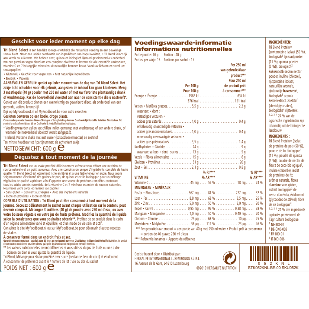 - Geniet op ieder moment van de dag van Tri Blend Select. Schud de verpakking voorzichtig voor ieder gebruik aangezien de inhoud kan gaan klonteren. Meng 3 eetlepels (40 g) poeder met 250 ml water of je favoriete melkalternatief of vruchtensap***.
